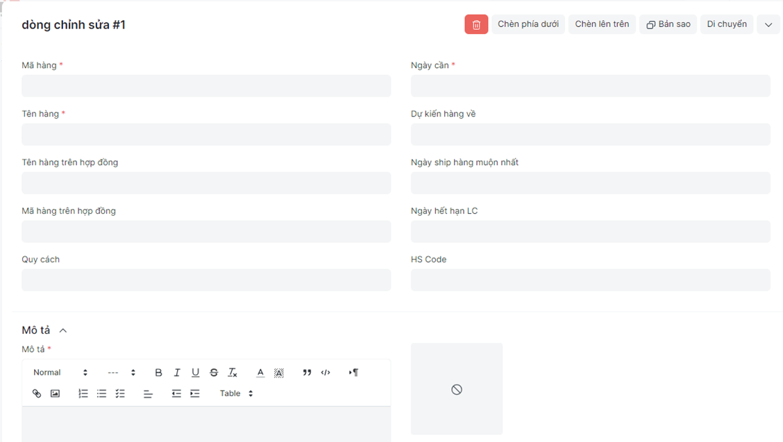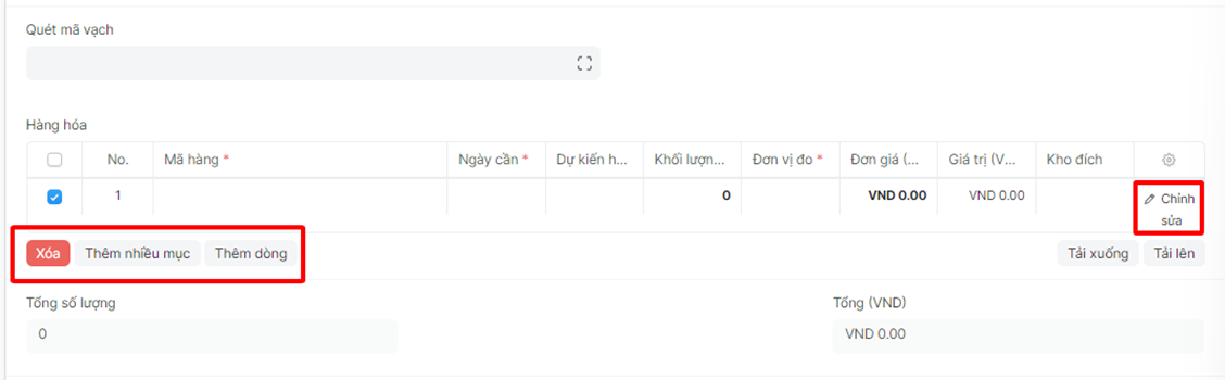 Bước 4: Điền các thông tin chi tiết của bảng hàng hóa: Có thể bấm vào “Thêm dòng”, và “Chính sửa” để thêm dòng và chỉnh sửa thông tin của mã hàng, có thể bấm vào “Xóa” để xóa dòng mã hàng: