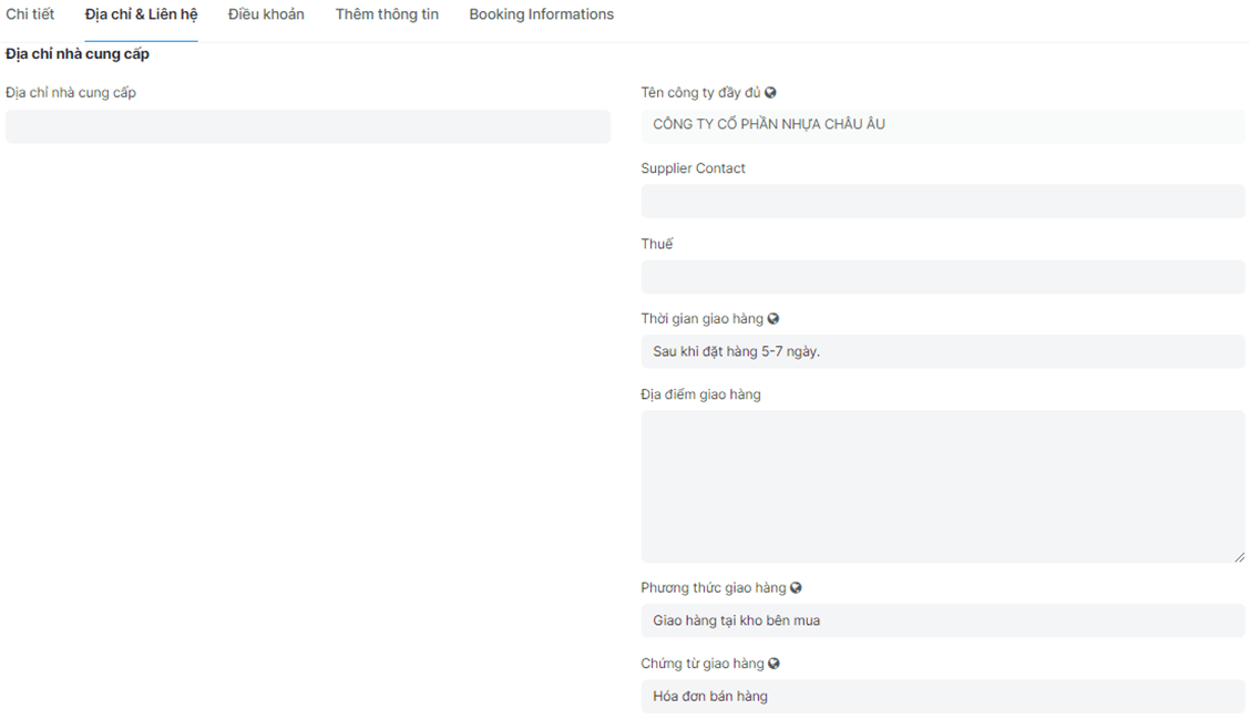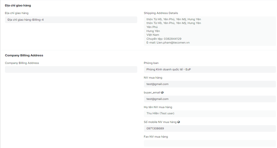 Bước 6: Kiểm tra, sửa lại các thông tin địa chỉ liên hệ: Phần địa chỉ nhà cung cấp, Phần địa chỉ giao hàng, Phần thông tin người mua hàng