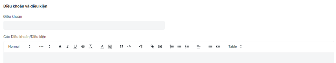 - Nhập các thông tin điều khoản và điều kiện: Điều khoản, Các điều khoản điều kiện