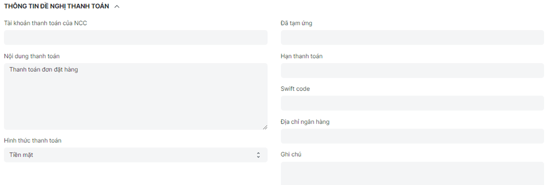 - Nhập các thông tin đề nghị thanh toán nếu có: Tài khoản thanh toán của NCC, Nội dung thanh toán, Hình thức thanh toán, Đã tạm ứng, Hạn thanh toán, Swift code, Địa chỉ ngân hàng, Ghi chú