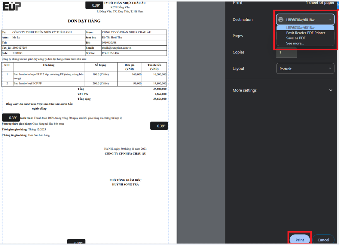 => chọn tên máy in nếu cần => Bấm “Print” để in phiếu: