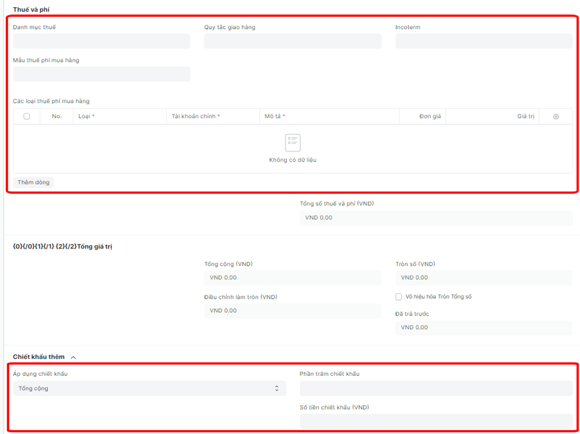 Bước 5: Điền các thông tin về các loại thuế, phí, chiết khấu nếu có: Incoterm, Loại thuế phí, Đơn giá, phần trăm chiết khấu, Số tiền chiết khấu,…