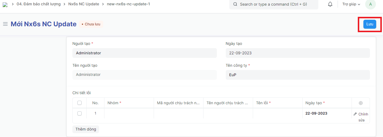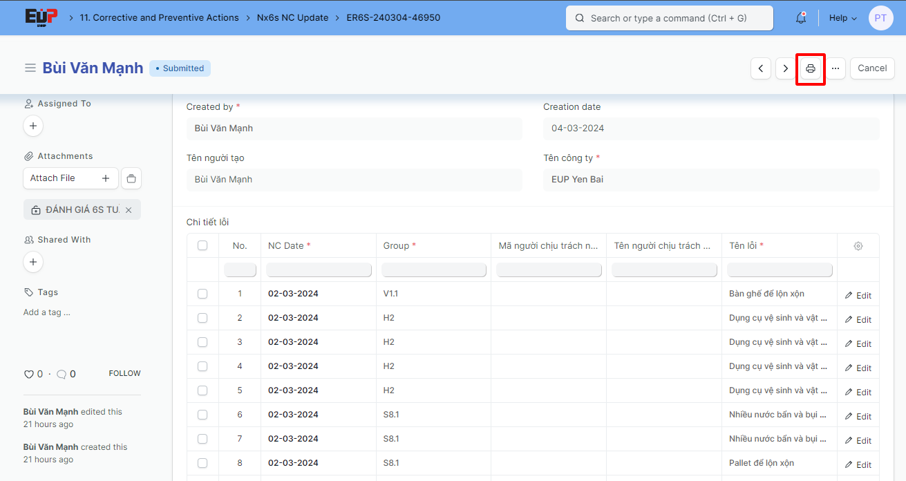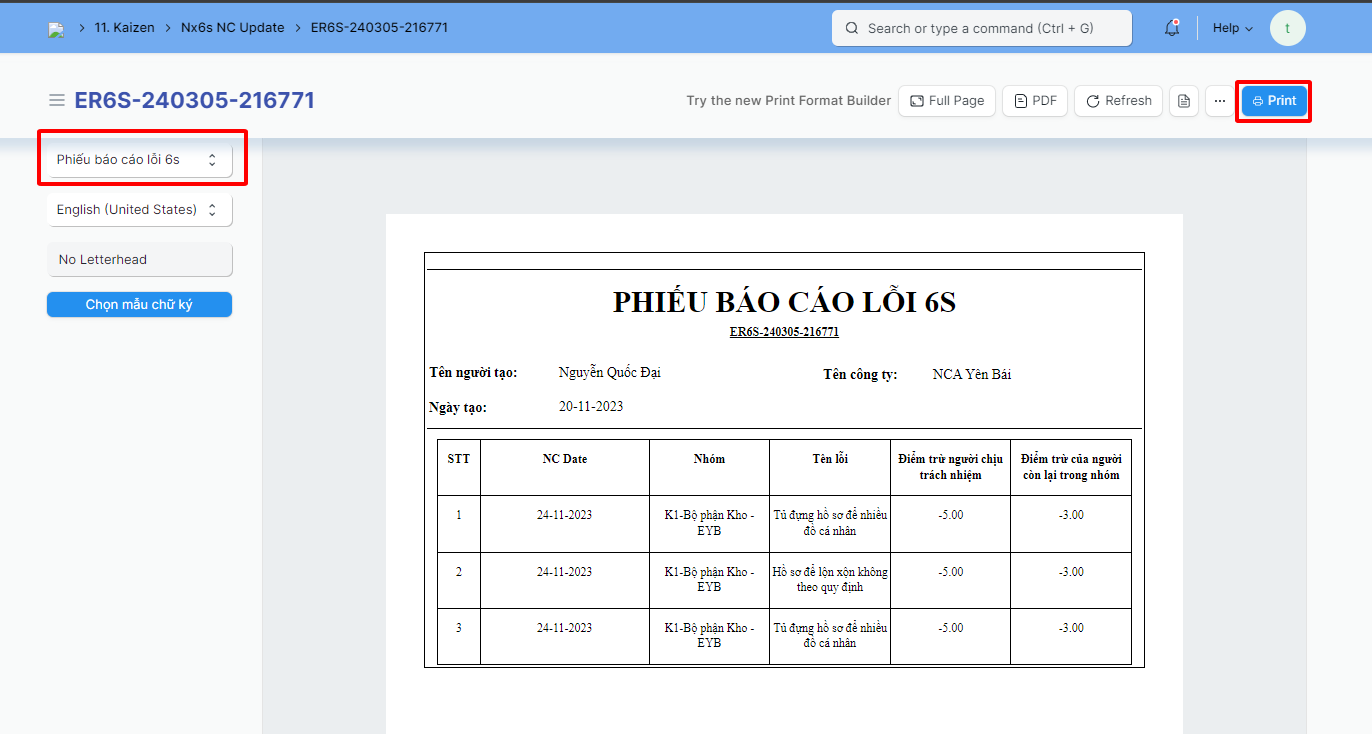 Tạo Phiếu báo lỗi không phù hợp 6S: