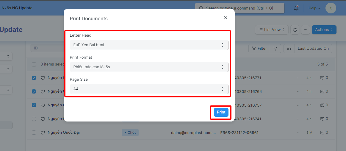 Bước 2: Chọn mẫu bản in - Bấm in để in phiếu