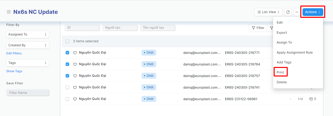 Bước 2: Bấm vào Action (Hành động) => chọn Print (In)