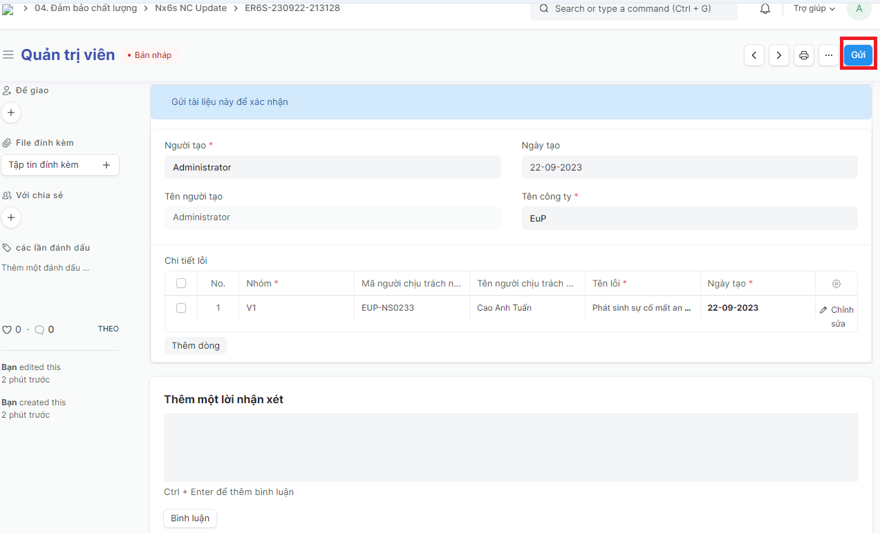 Bước 4: Tích vào Lưu để lưu Phiếu báo lỗi 6S vừa tạo => Tích vào Gửi => Chọn "Không" hoặc "Đồng ý" để chốt Phiếu báo lỗi 6S vừa tạo