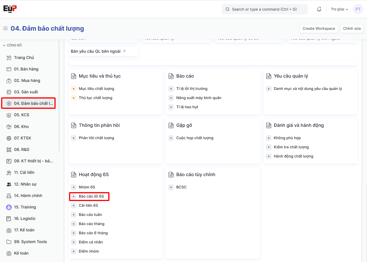 Khi cần tạo Phiếu để update danh sách lỗi không phù hợp 6S, người dùng truy cập vào chức năng Phiếu lỗi 6S theo đường dẫn: