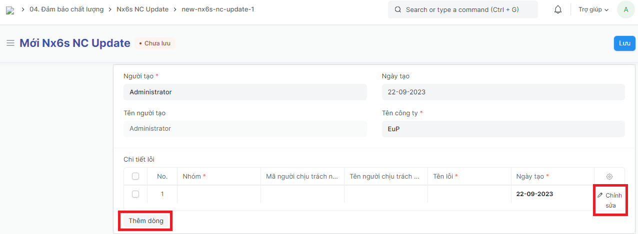 Bước 3: Nhập thông tin bảng chi tiết lỗi (Các trường có dấu sao là các trường bắt buộc điền): Người dùng có thể tích vào "Thêm dòng" để thêm lỗi cần điền, tích vào "Chỉnh sửa" để sửa thông tin chi tiết từng lỗi và đính kèm ảnh vi phạm lỗi nếu có:
