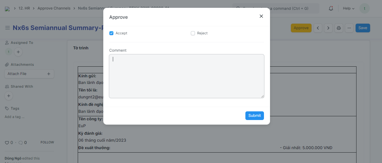 Bước 3: Bấm "Accept" để duyệt hoặc "Reject" để từ chối đề xuất => nhập ý kiến vào ô comment nếu có => Bấm Submit để chốt duyệt hay không
