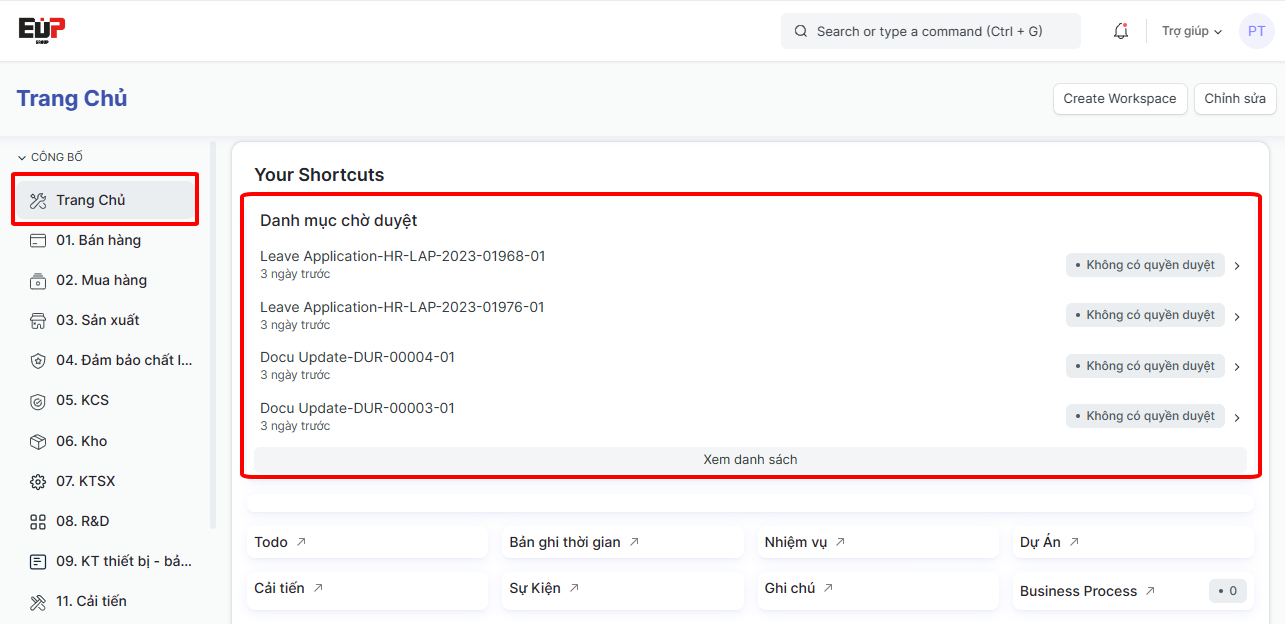 Bước 1: Truy cập vào chức năng Phê duyệt theo đường dẫn: Trang chính > 12. HR > Phê duyệt, hoặc Trang chính > Trang chủ > Danh mục chờ duyệt
