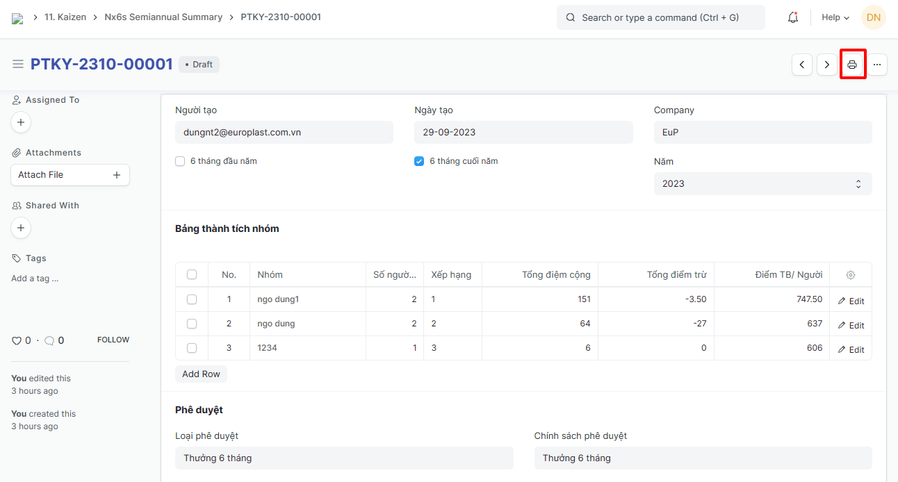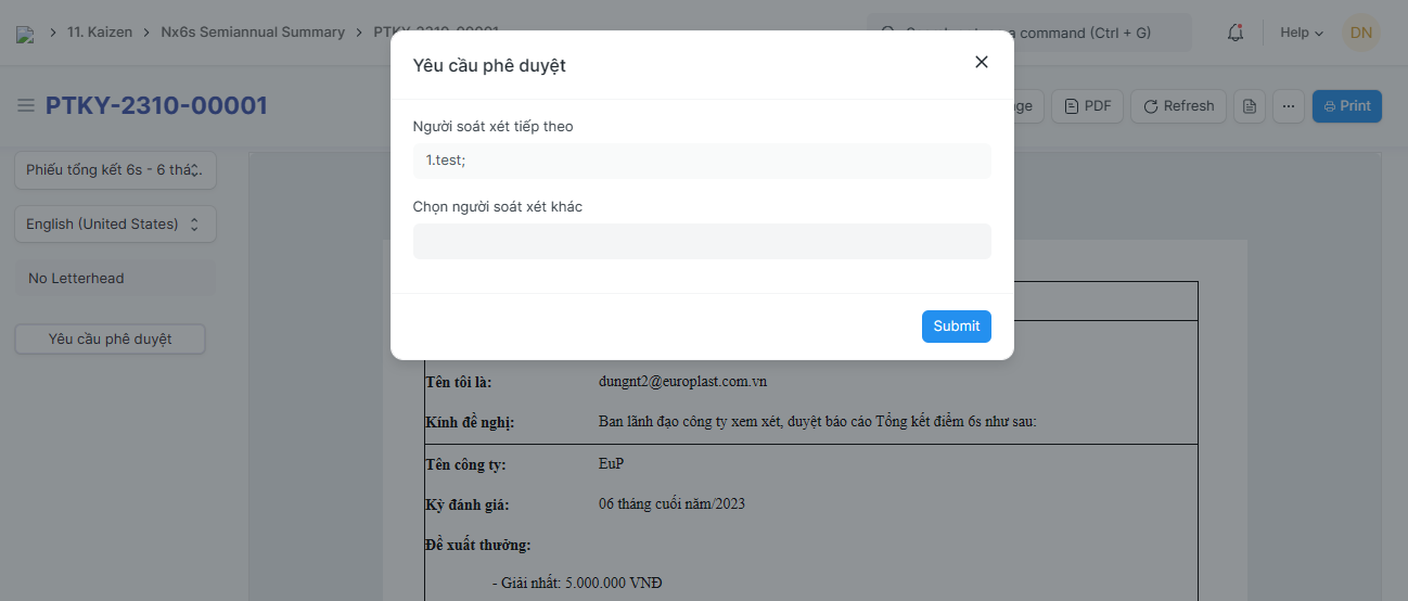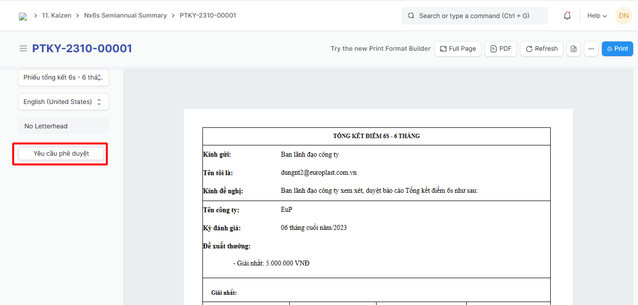 Bước 4: Sau khi lưu phiếu Tổng kết 6s - 6 tháng vừa tạo, người tạo Phiếu phải gửi Yêu cầu phê duyệt phiếu để ban chỉ đạo xem xét và phê duyệt: