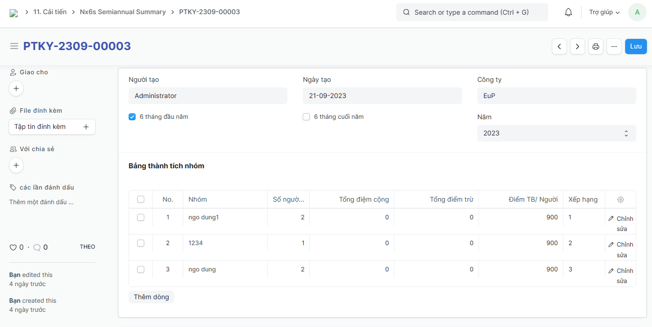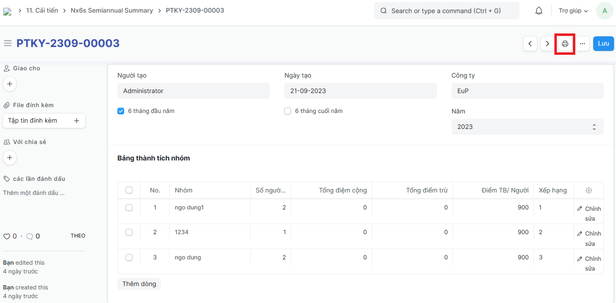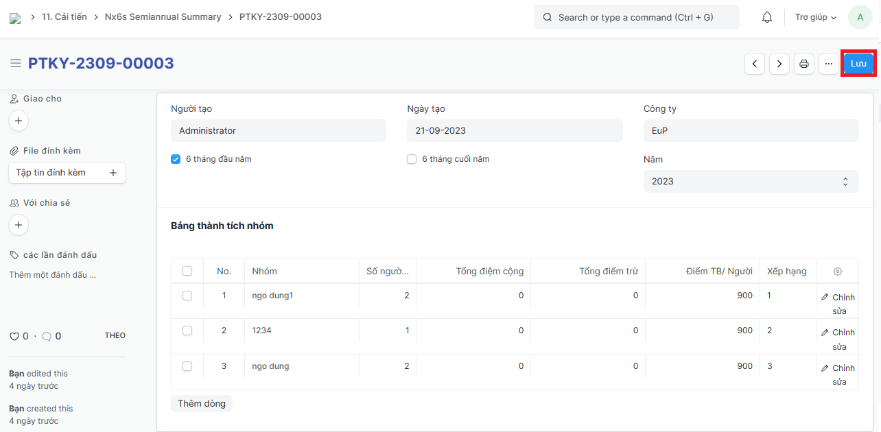 Bước 3: Tích vào Lưu để lưu Phiếu tổng kết 6S - 6 tháng vừa tạo:
