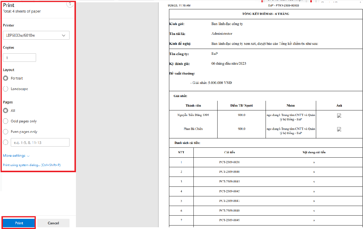 Bước 3: Chọn máy in, chỉnh sửa định dạng bản in nếu cần => Tích vào Print để in Phiếu