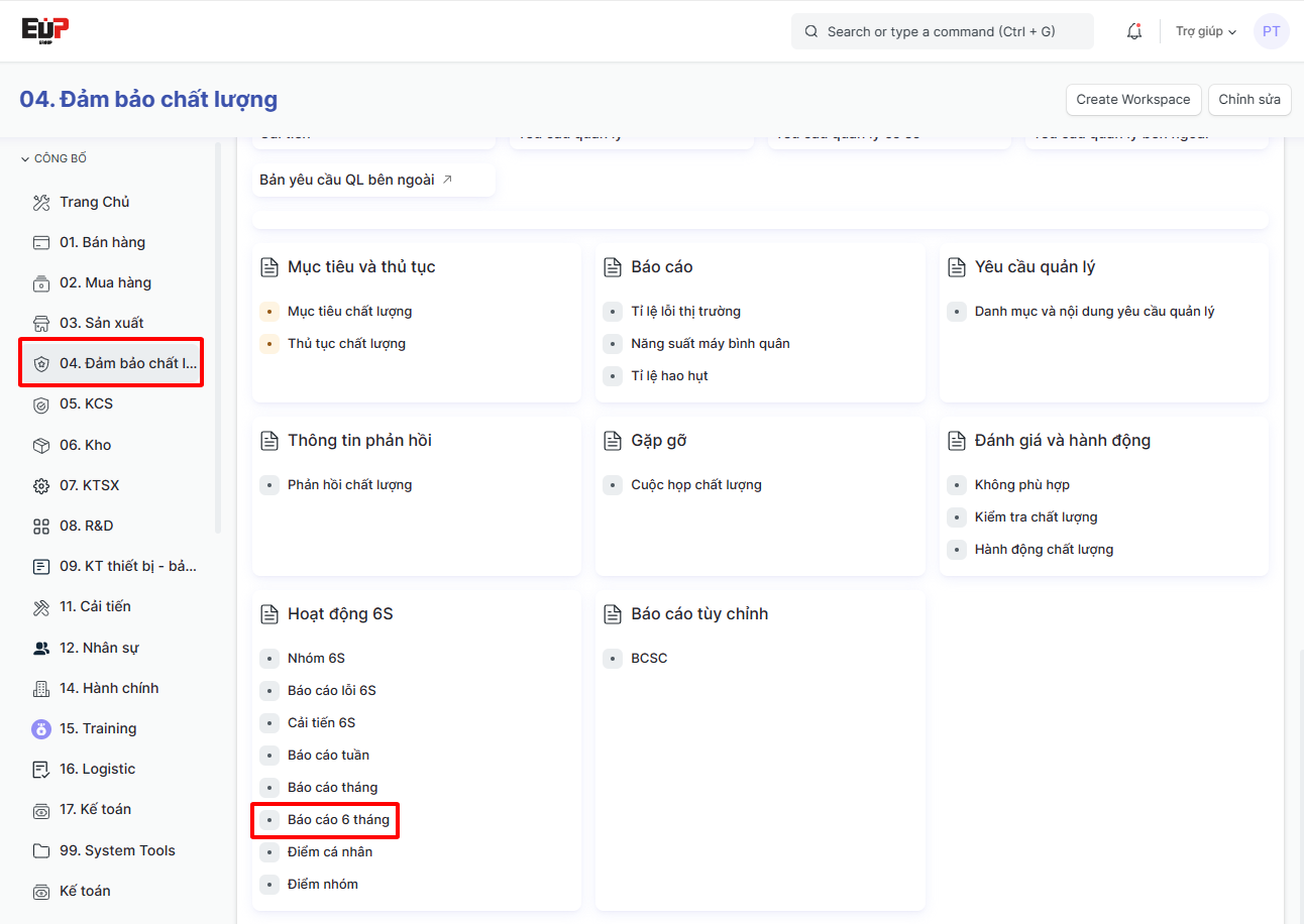 Bước 1: Truy cập vào chức năng Tạo Phiếu Tổng kết 6S - 6 tháng theo đường dẫn: Trang chính > 04. Đảm bảo chất lượng > Báo cáo 6 tháng > Bấm “Thêm Nx6s Semiannual Summary“;