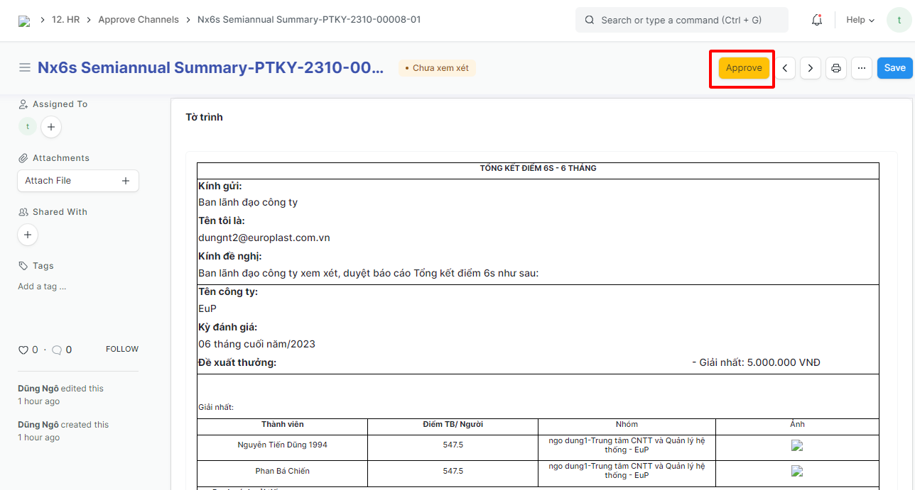 Bước 2: Mở yêu cầu cần phê duyệt => Kiểm tra nội dung yêu cầu => bấm vào Approve