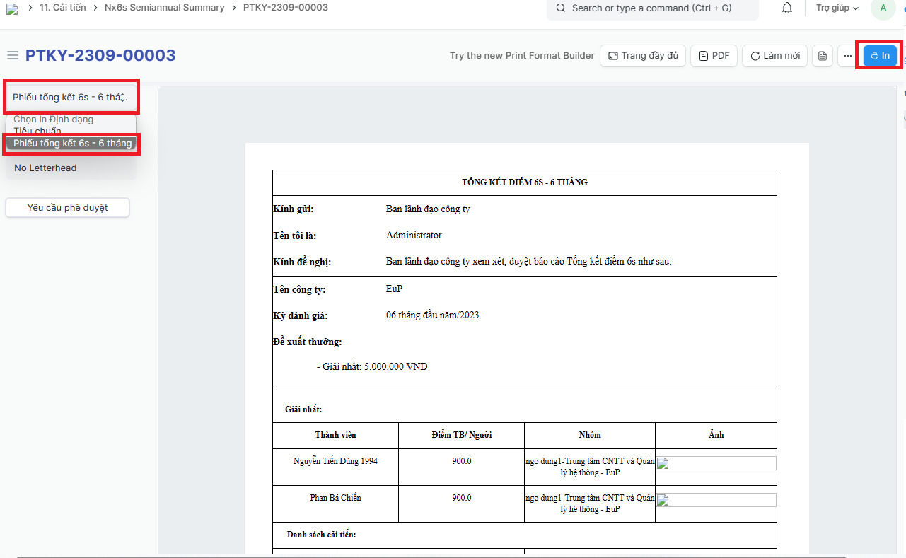 Tạo và in ký duyệt Phiếu tổng kết 6S - 6 tháng tại nhà máy: