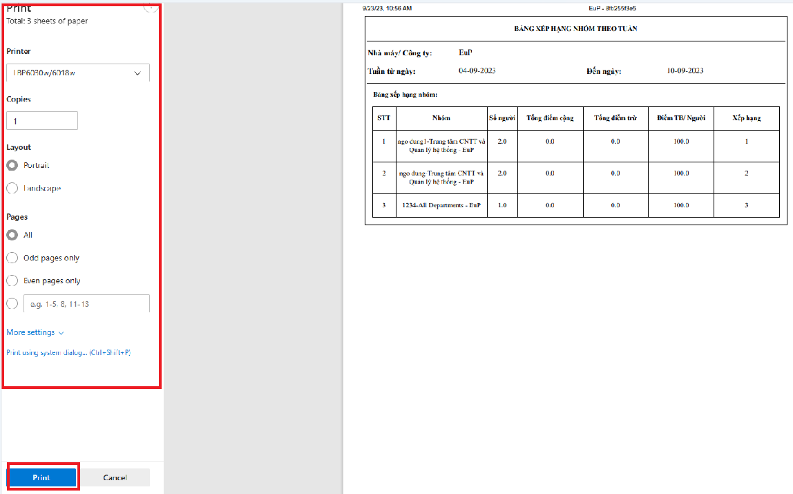 3. In Phiếu Tổng kết 6S tuần:
