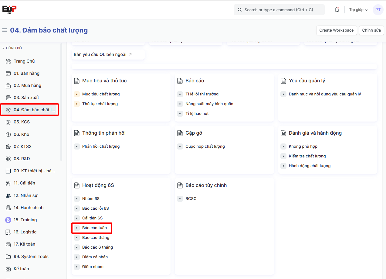 Bước 1: Truy cập vào chức năng Tạo Phiếu Tổng kết 6S tuần theo đường dẫn: Trang chính > 04. Đảm bảo chất lượng > Báo cáo tuần > Bấm “Thêm Nx6s Week Summary“;