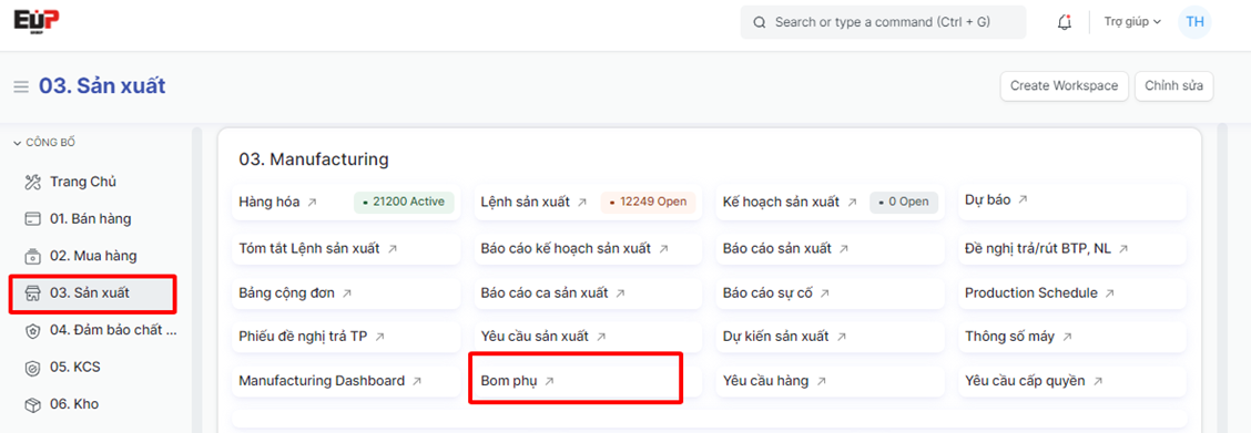 Bước 1: Truy cập vào chức năng Tạo BOM phụ theo đường dẫn: Trang chính => Sản xuất => BOM phụ:
