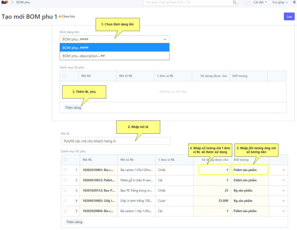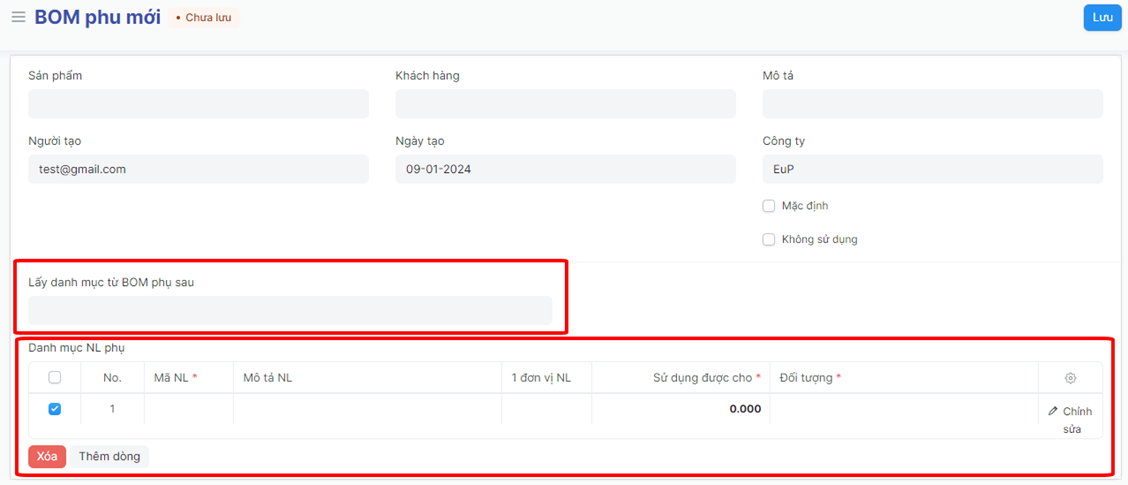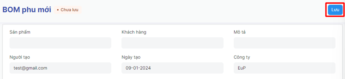 Bước 5: Bấm “Lưu” để lưu thông tin BOM phụ vừa tạo