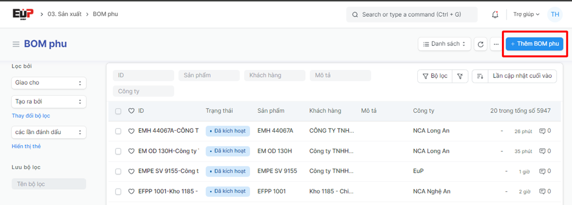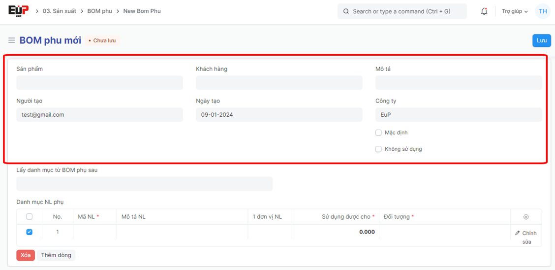 - Khách hàng: Nhập tên khách hàng sử dụng BOM phụ đang tạo