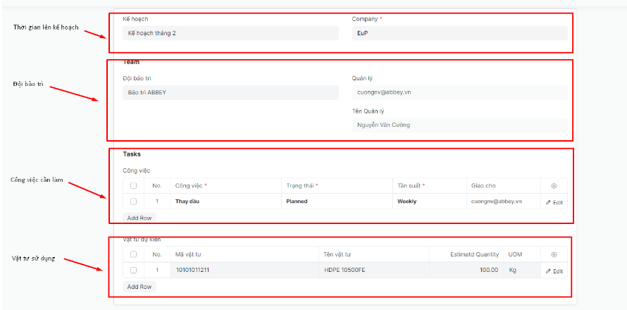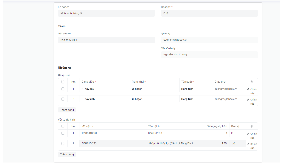 Bước 3: Điền chi tiết các công việc trong thiết lập bảo trì đề ra