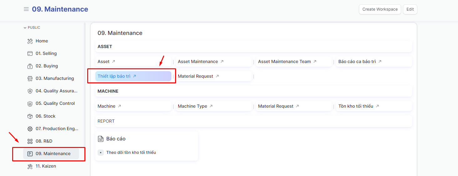 Bước 1: Tại mục 09.KT thiết bị - bảo trì chọn shortcut Thiết lập bảo trì