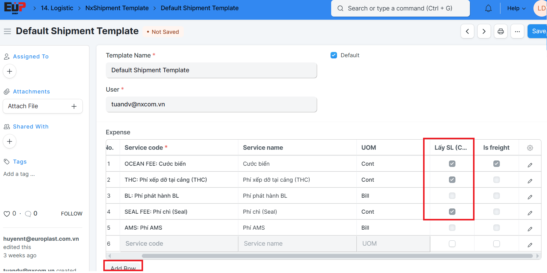 Nhấn add row, chọn item code tương ứng vừa thêm và tích vào lấy Số lượng nếu cước phí tính theo số Cont ở Shipment