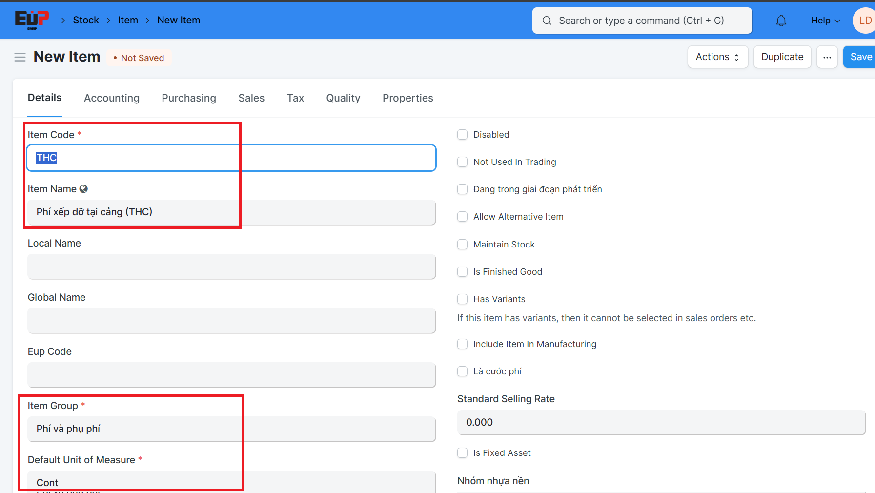 Vào danh sách Item ở Link sau : https://erp.eup.vn/app/item?item_group=Ph%C3%AD%20v%C3%A0%20ph%E1%BB%A5%20ph%C3%AD