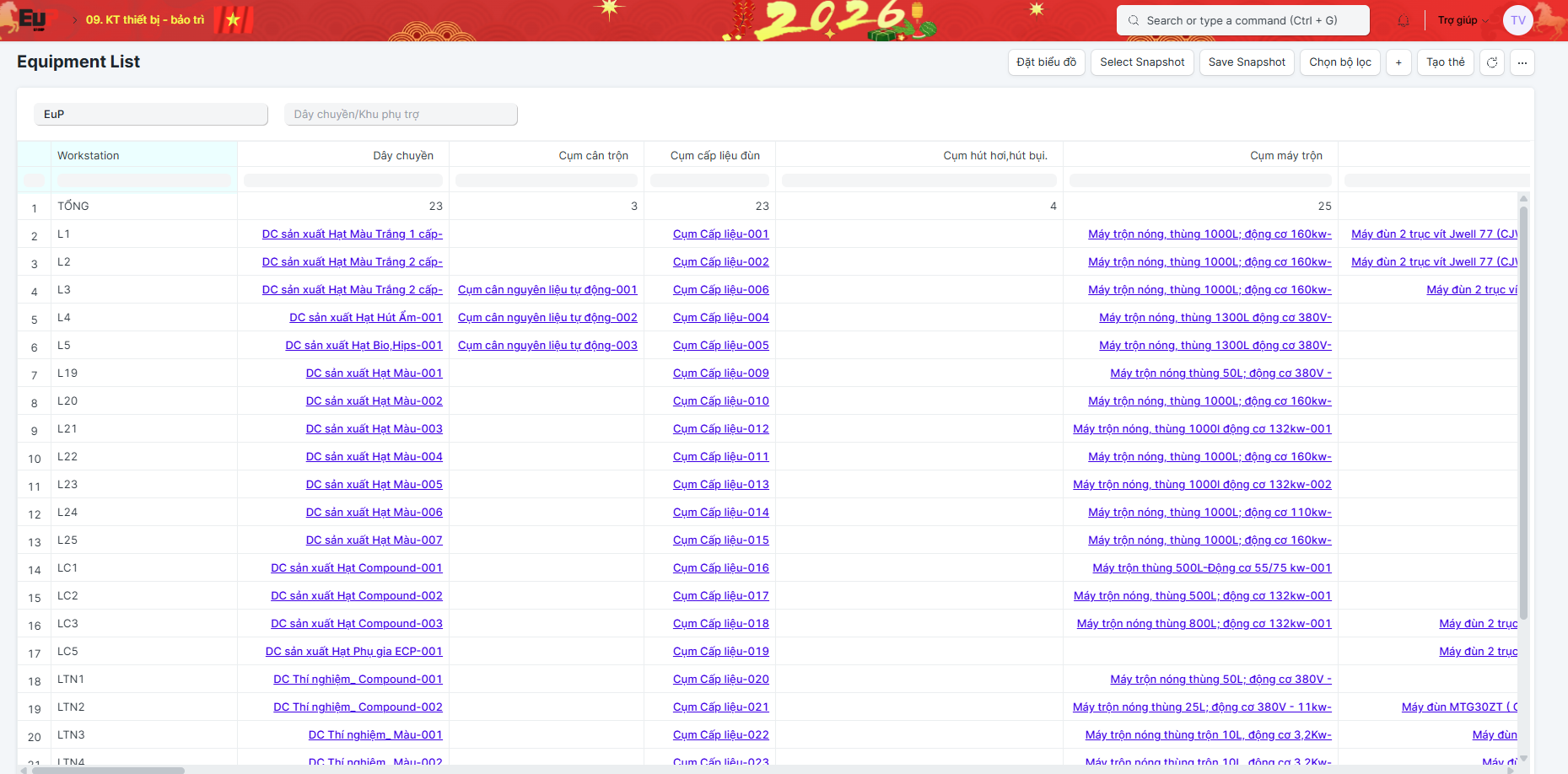 Các thiết bị được liệt kê theo từng dây chuyền/khu vực thuộc quản lý của nhà máy.